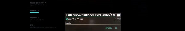 4. Нажать на "Плейлист", после чего появится окно, где необходимо ввести ссылку: http://iptv.matrix.online/playlist/?format=m3uuni