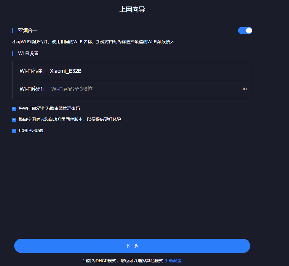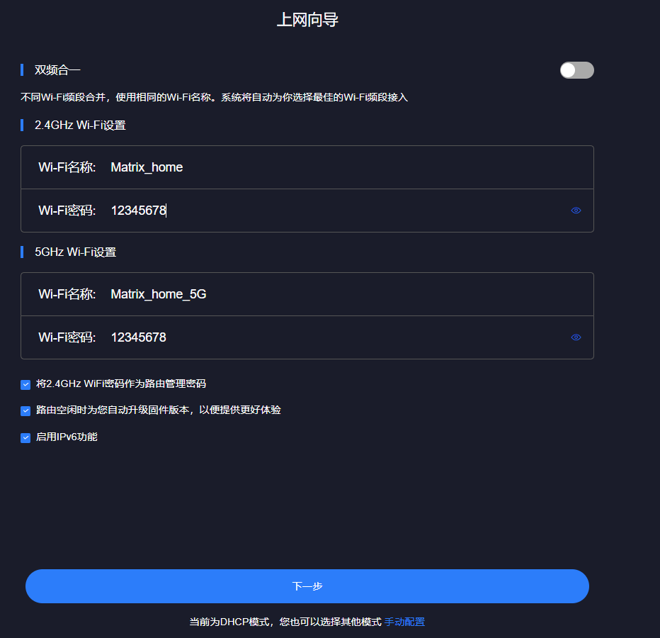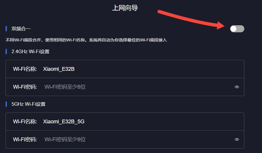 рекомендуется нажать на ползунок, перевести его в неактивное положение для задания двух разных сетей с частотой 2.4GHz и 5GHz
