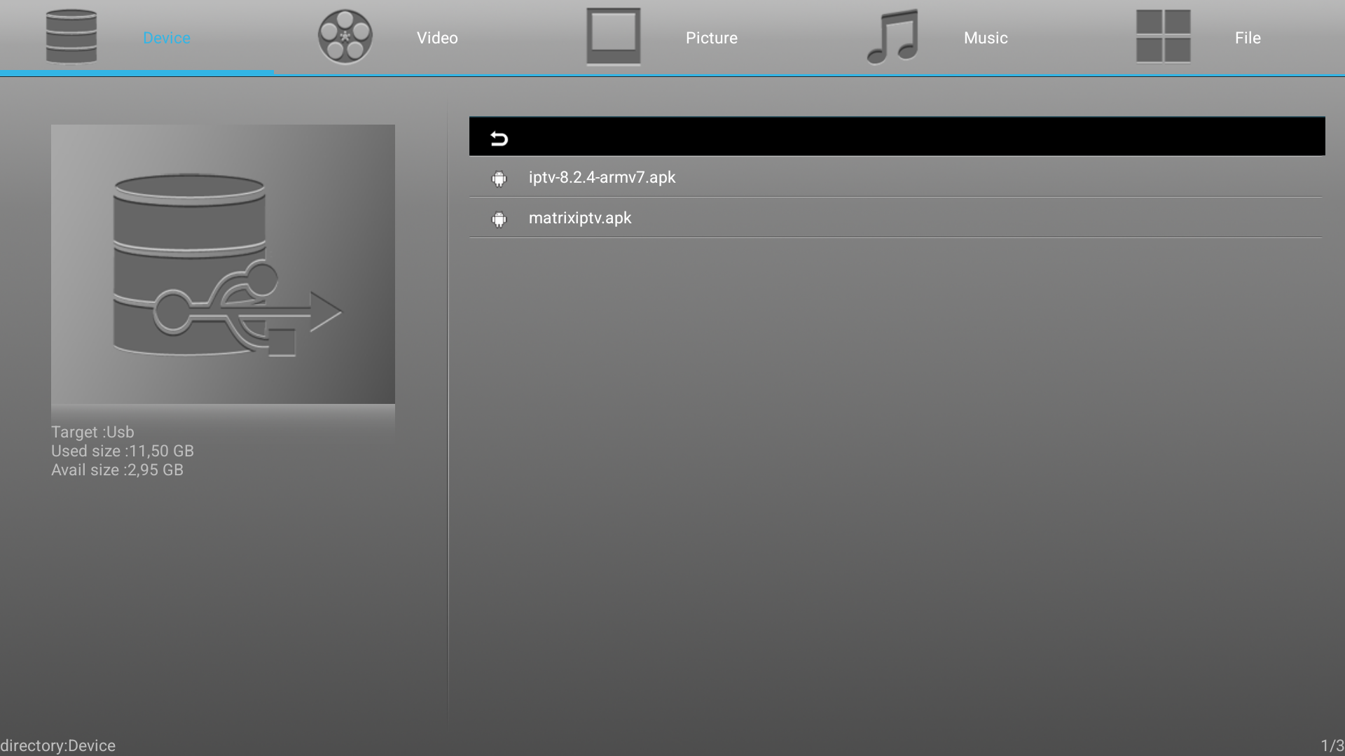 Подключите «флешку» с загруженными установочными файлами приложений к ТВ-приставке. Через несколько секунд в верхней части экрана появится логотип USB-подключения. Это означает, что Ваша «флешка» успешно распознана приставкой, и можно приступать к установке.