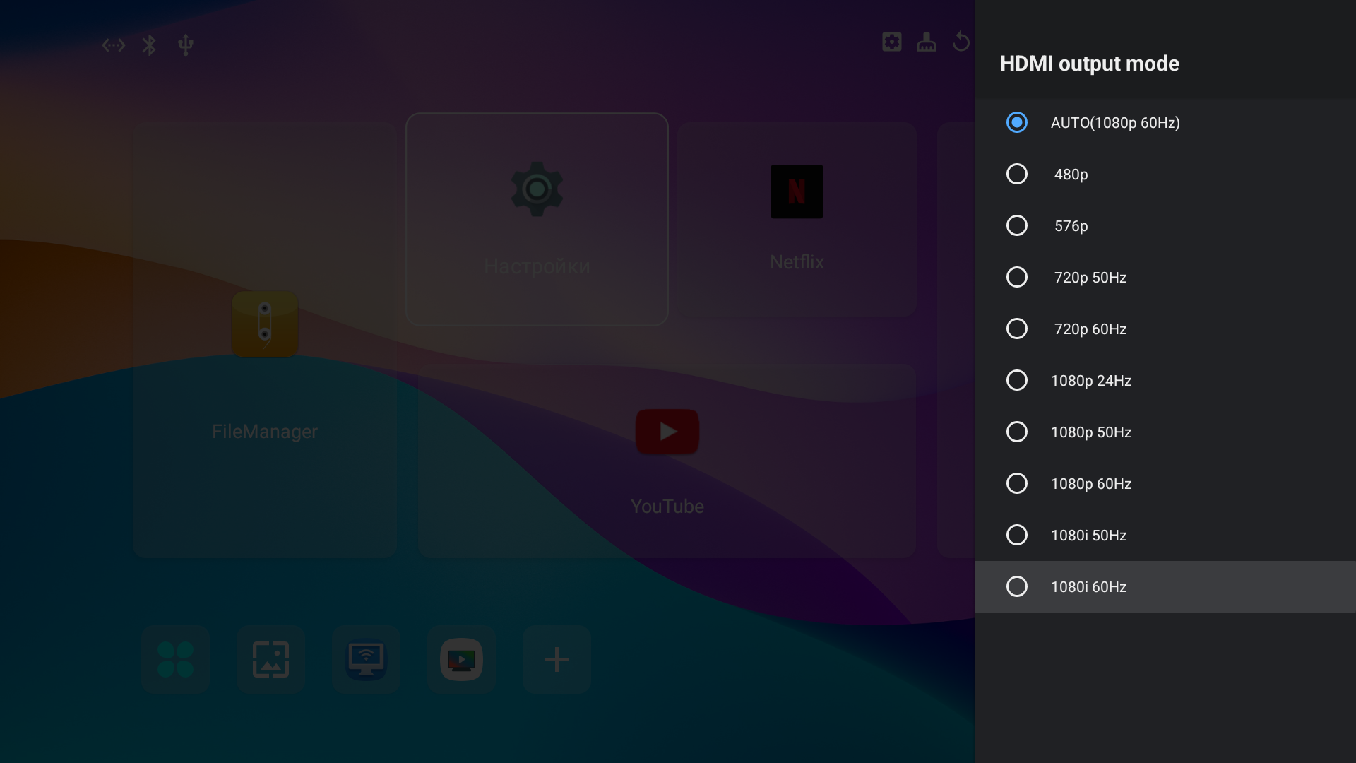 Если Вы не знаете точные параметры экрана Вашего телевизора - рекомендуется выбрать пункт AUTO. Для достижения наилучшего качества изображения при использовании сервиса IPTV - рекомендуется установить режим 1080р 50Hz.