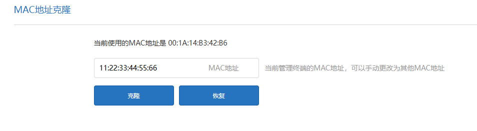 задаём в поле MAC-адрес, при необходимости, можно склонировать с ранее установленного маршрутизатора или другого устройства, подключённого к сети MATRIX. Для применения настроек нажимаем на синюю кнопку, расположенную слева. В течении нескольких секунд изменения будут применены. Для восстановления заводского MAC-адреса необходимо нажать синюю кнопку справа.