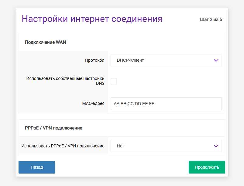 Переходим в пункт «Сеть» → «Настройка WAN». В подразделе «Подключение WAN» выбираем «Дополнительные настройки». Далее в поле «Назначить MAC-адрес» указываем MAC , который хотим задать для роутера.