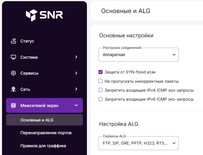 -Переходим в меню слева «Межсетевой экран» → Основные и ALG . Если стоит галочка напротив пункта «Запретить входящие IPv4 ICMP эхо-запросы» снимаем её.