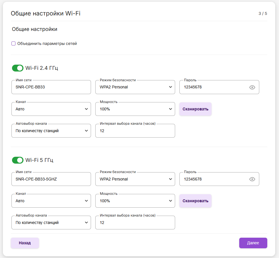 Роутер предложит настроить сеть wi-fi. «Канал» выставляем «Авто» чтобы при перезагрузки роутер сам выбирал подходящий для работы wi-fi сети. Также роутер будет выбирать канал по указанному правилу по умолчанию в стандартный интервал 12 часов. Указываем предпочитаемое «Имя сети и пароль» для каждого из диапазонов. Рекомендуется, если имена сетей одинаково заданы, для имени сети 5 ГГц в конце добавить «5G» для различия.