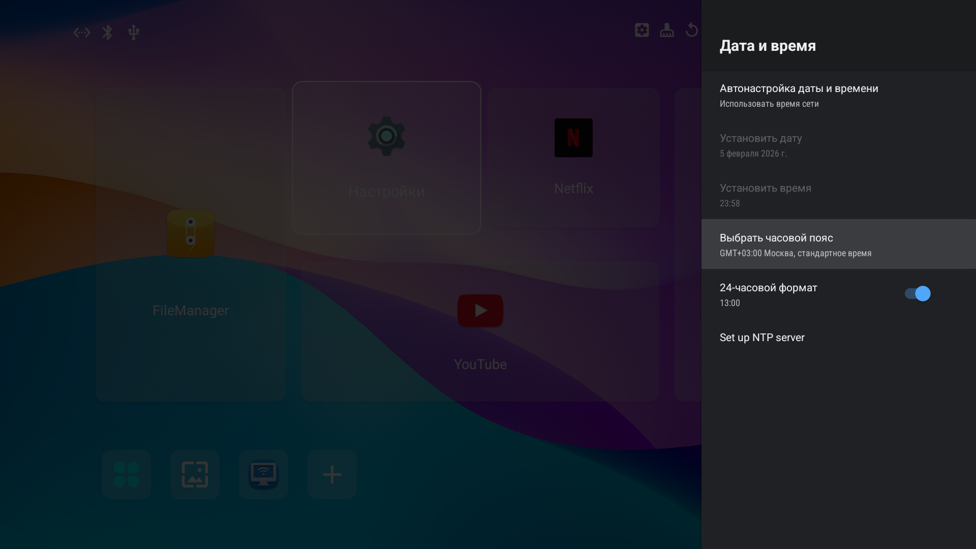 В меню настроек перейдите в раздел Дата и время. Выберите Часовой пояс: Москва, стандартное время, GMT+03:00.