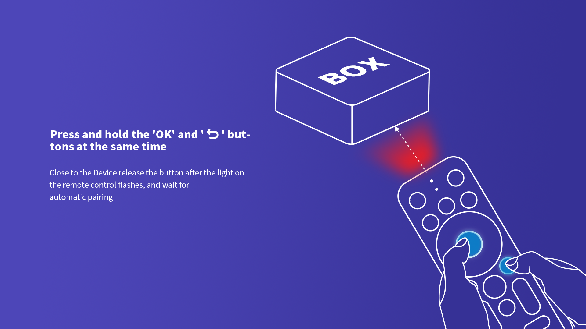 Нужно одновременно нажать и удерживать кнопки «ОK» и «Назад» для сопряжения или же пропустить нажав «Дом» на пульте.
