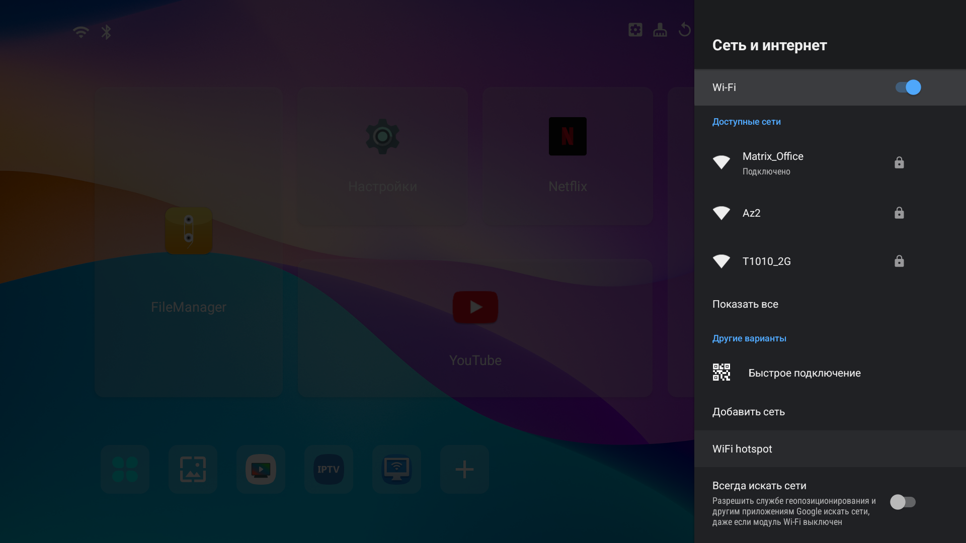 Убедившись что wi-fi включен переключателем сверху, смотрим на список «Доступные сети», если в нем не отображается Ваша сеть роутера, нажмите ниже Показать все чтобы увидеть полный список сетей , которые видит приставка.